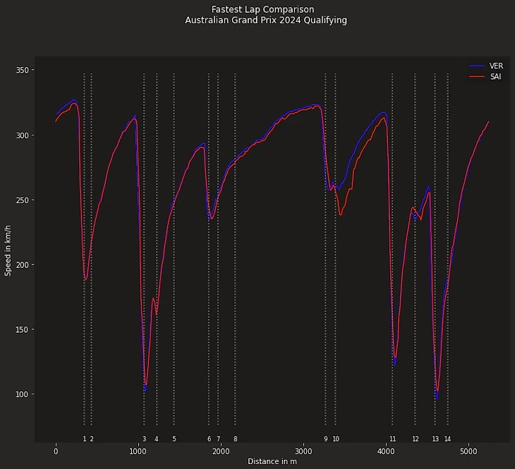 Сравним лучшие круги в квалификации Гран-при Австралии 2024 года, в который раз сравним круги обладателя поул-позиции Макса Ферстаппена и Карлоса Сайнца.
