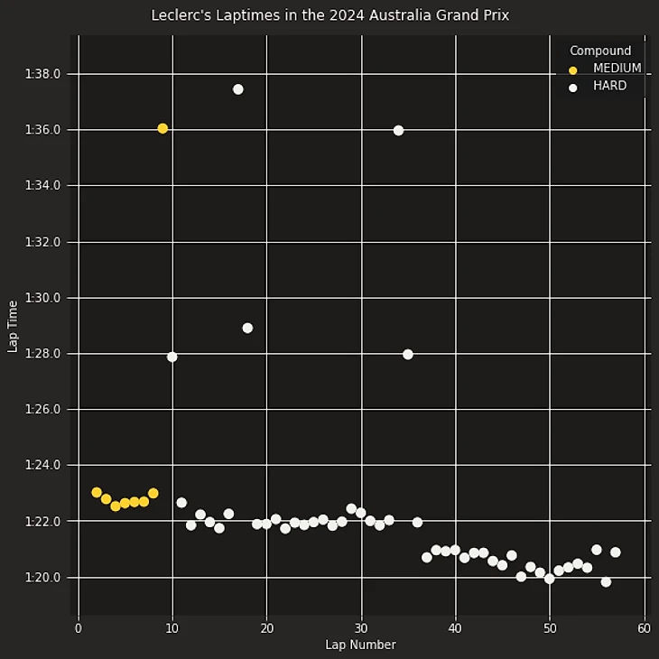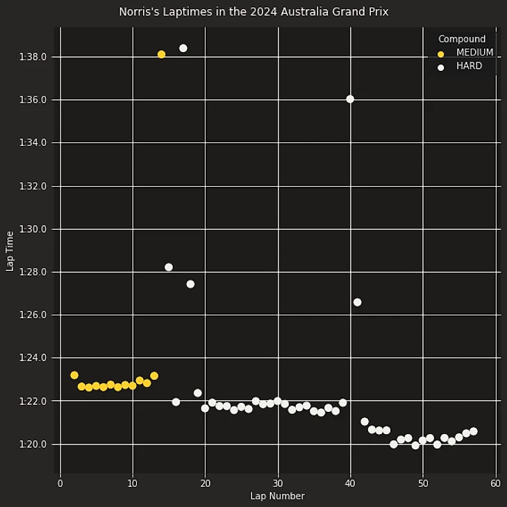По оси х отложены круги гонки, по у - время гонщика. Цвет кружочка отражает типы шины: желтый - медиум, белый - хард.