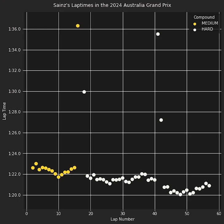 Нанесем на график время прохождения круга призеров Гран-при Австралии 2024 Карлоса Сайнца (победителя) Шарля Леклера (занявшего второе место) и Ландо Норриса (занявшего третье место) в гонке с учетом типа шин.