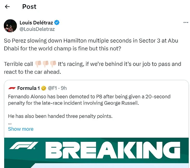 Стюарды посчитали маневр с торможением «потенциально опасным пилотажем» и выписали Фернандо штраф в виде проезда по пит-лейн – который из-за финиша гонки превратился в 20 секунд (так много, потому что с этого сезона базовый штраф составляет 10 секунд) и три штрафных балла в лицензию (до этого Алонсо был чист).