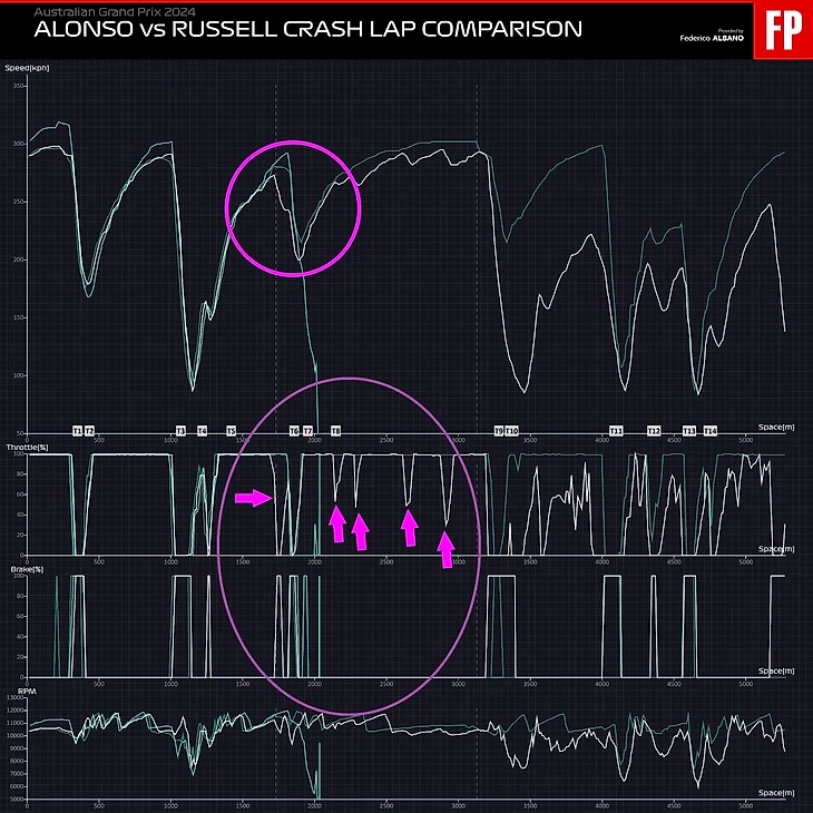 А это телеметрия эксперта Федерико Альбано: здесь данные Алонсо (белый цвет) и Расселла (бирюзовый) с круга маневра. Видно, как перед аварией британец сумбурно работал с тормозом, поскольку не ожидал маневра Фернандо. Сам же пилот «Астон Мартин» после выхода из седьмого поворота еще и странно нажимал на газ.