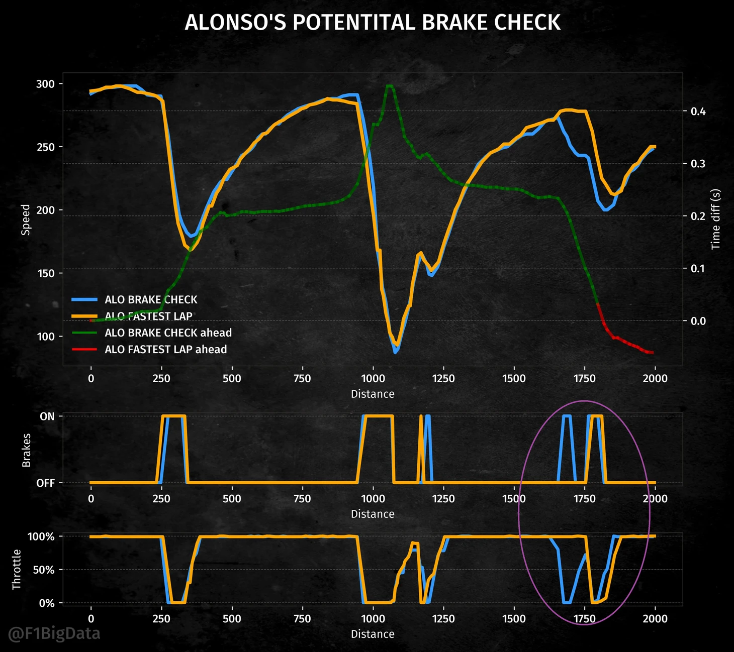 «Телеметрия показывает, что Алонсо поднял ногу с газа чуть более чем на 100 метров раньше, чем когда-либо до этого при заходе в данный поворот во время гонки. Он также слегка затормозил в тот момент, когда обычно не тормозил (хотя торможение было настолько незначительным, что не стало основной причиной замедления его машины), и переключился на пониженную передачу в момент, когда обычно никогда не переключался на пониженную передачу. Затем снова переключился на повышенную передачу и ускорился до поворота, прежде чем снова сбросить газ, чтобы пройти поворот.