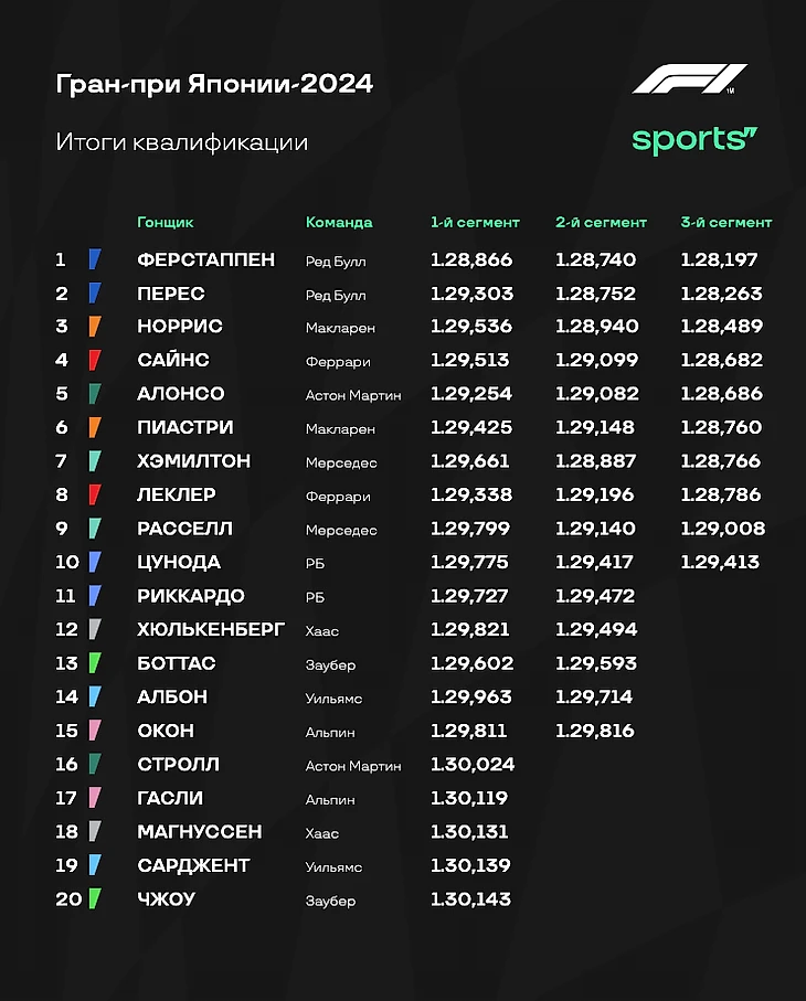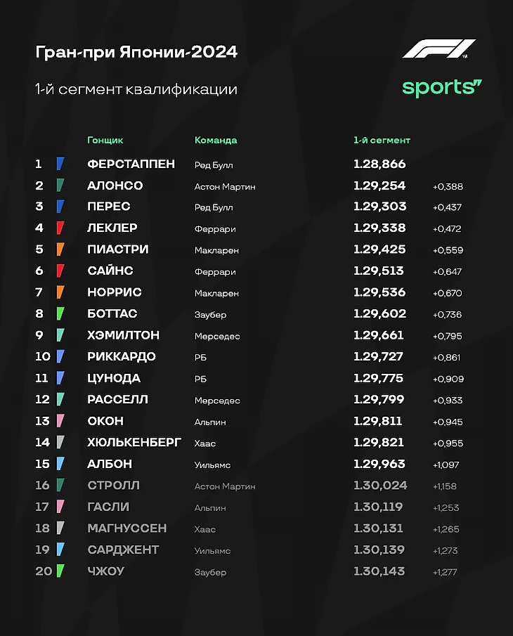 Интересненько. Перес в первой попытке уступил Максу всего 0,012 секунды. Притом, что Макс свое время относительно Q1 улучшил. Неужто будет борьба в «Ред Булл»?