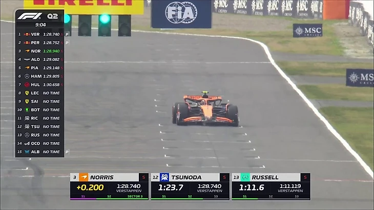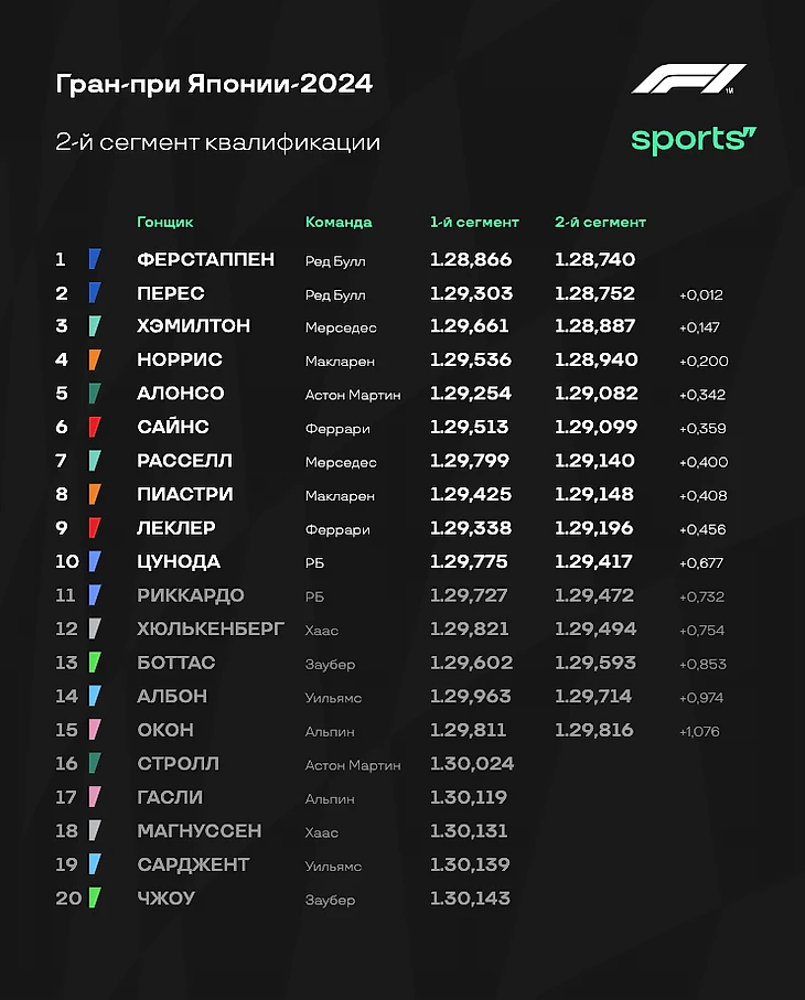 Второй сегмент обошелся вообще без сюрпризов. Первые 5 команд намного быстрее всех остальных. В топ-10 проходят «Ред Булл», «Феррари», «Мерседес» и «Макларен» в полном составе, а также Алонсо. Место, которое «освободил» Стролл занимает Цунода. Из борьбы выбыли: Риккардо, Хюлькенберг, Боттас, Албон и Окон.