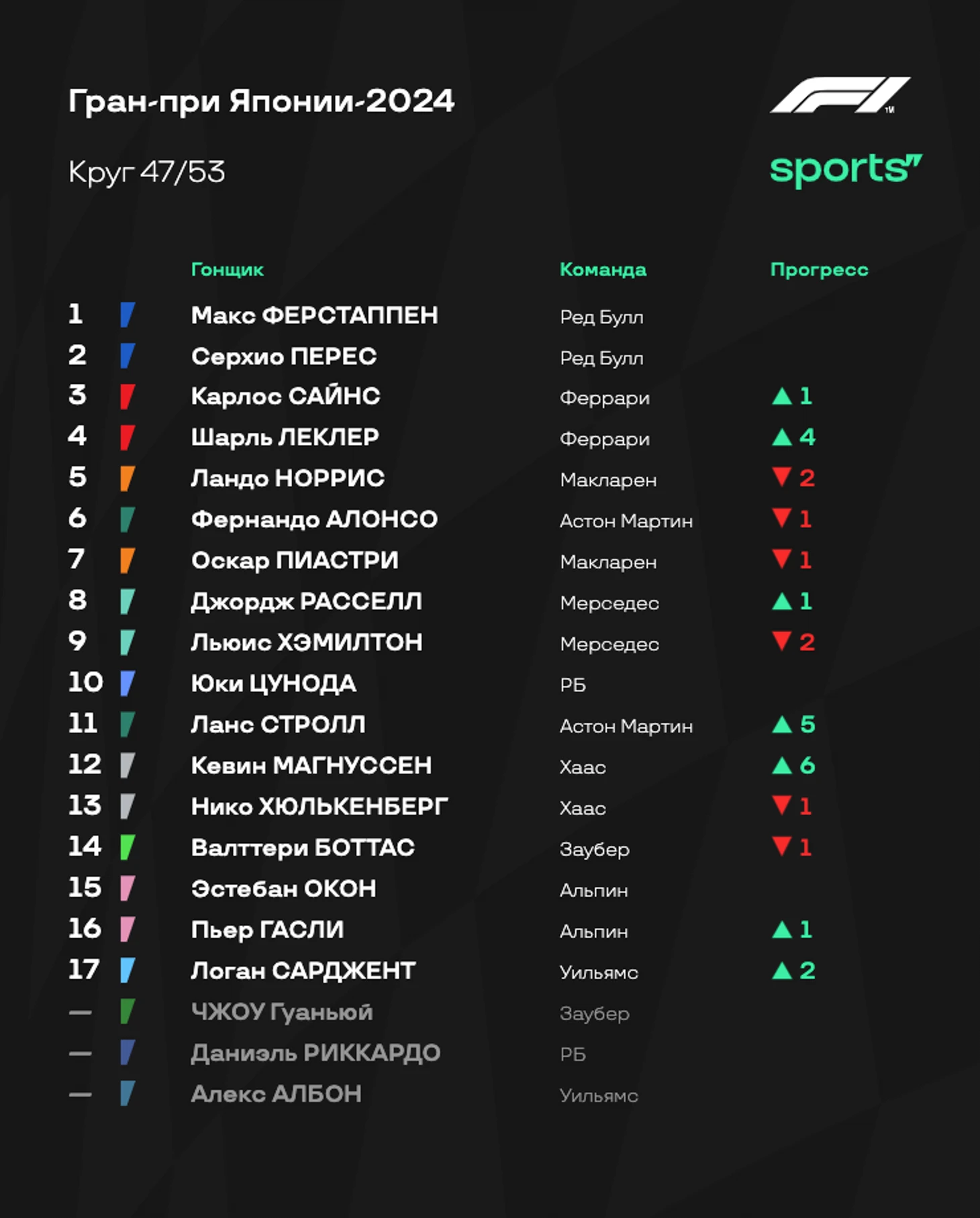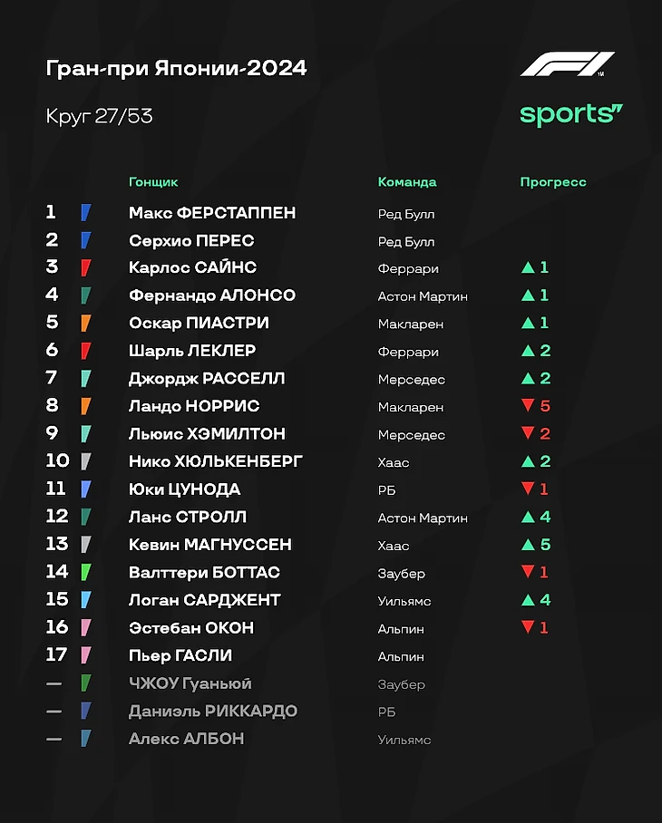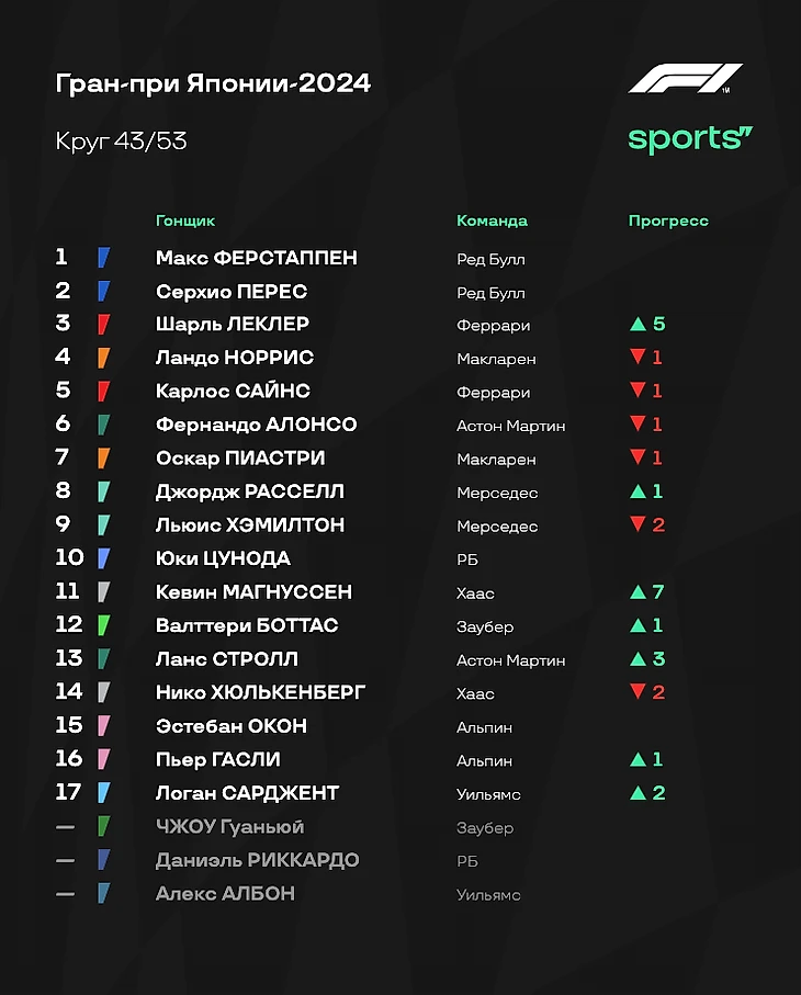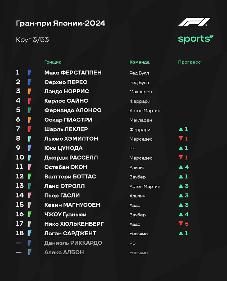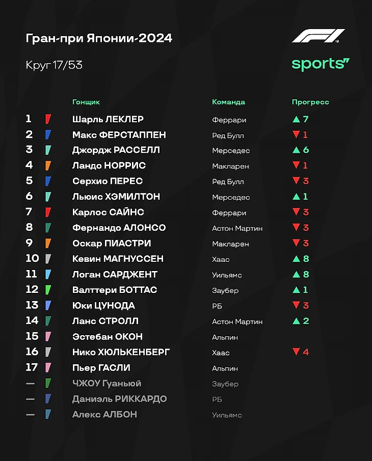- «Ред Булл» все-таки преувеличивали, говоря о гоночном темпе соперников. В гонке у «быков» не было серьезных проблем относительно других. Ферстаппен практически ни с кем не боролся, Перес уверенно проходил конкурентов после пит-стопов. Так что Гран-при Японии прошел по классике. - «Феррари» на удивление отлично справилась со стратегией: Шарль Леклер с помощью одного пит-стопа смог доехать до четвертого места, Карлос Сайнс на двух пит-стопах все-таки стал третьим. В начале гонки темпа у Скудерии было не так много, но потом красный болид здорово вкатился - видимо, у итальянцев и вправду есть проблемы с прогревом резины. Зато потом отличный и стабильный темп. - «Макларен» выглядел не очень уверенно. Стратегию пришлось корректировать прямо по ходу гонки - вспомните момент, когда Норриса позвали в боксы из-за подъезжавшего Расселла. Пиастри тоже было тяжело бороться с Джорджем. Очень интересно послушать объяснения команды после финиша - видимо, плохо удалось справиться с износом шин. - Алонсо сделал то, что должно. Фернандо изначально не рассчитывал на супервысокие позиции и говорил о том, как важно хотя бы оказаться впереди «Мерседеса». С этим испанец справился, однако по очкам разница нулевая: шестая строчка принесла «Астон Мартин» 8 очков - и ровно столько же заработали Расселл и Хэмилтон вместе. - Цунода провел очень классную гонку, принеся еще одно очко «РБ» - а это очень важно для команд из второго эшелона чемпионата. И все это на фоне мега неудачного выступления Даниэля Риккардо с аварией на первом круге. В Китае Дэн должен получить новое шасси - но есть ощущение, что это может стать его первой и последней пробой нового элемента. - Жалко «Уильямс». Команда терпит невероятные убытки. Авария Албона в практиках Австралии и гонка одним болидом, авария Сарджента в пятницу в Японии и вот спустя пару дней еще одна авария. Команда отчаянно пытается вырваться из кризиса, но обстоятельства продолжают ее топить.