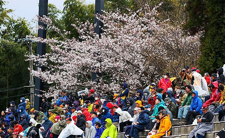 И нет, это не специально поставленные кадры, которые фотографы тщательно выискивали и ловили на отдельных локациях. Весь автодром выглядит так: фанаты под сакурой.