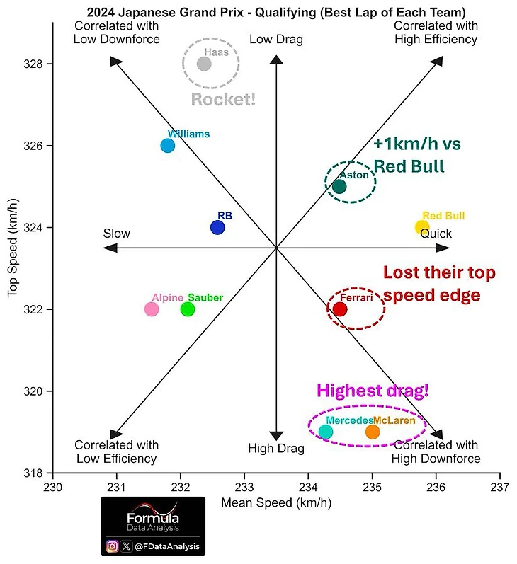 Списать провал можно было бы на несработавшие новинки, которые «Астон Мартин» привез в Японию, но результаты Фернандо Алонсо (5-й в квалификации и 6-й в гонке) и анализ поведения болидов говорят об обратном. Первый серьезный пакет обновлений позволил команде сократить разницу между квалификационным и гоночным темпом с 0,7 сек до 0,3 сек и сделать машину более предсказуемой и стабильной на дистанции воскресного заезда, а отставание от «Феррари» сократилось на 0,5 секунды в среднем. Даже новинки «Ред Булл» не произвели такого же эффекта!