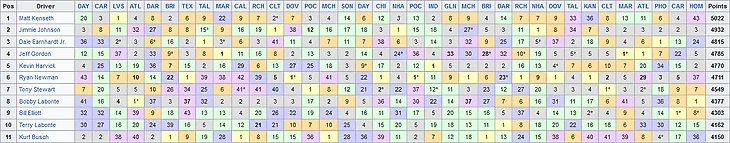 Несколько иным путём двигались системы, подобные NASCAR, с гонками на овалах, которые по своей природе были более непредсказуемыми. Овалы — это большая стартовая решётка, многочисленные жёлтые флаги и постоянные сходы. Что особого можно придумать для таких гонок? Например, огромное количество гонок и очки за круги лидирования. С таким подходом случайные сходы не так критичны.