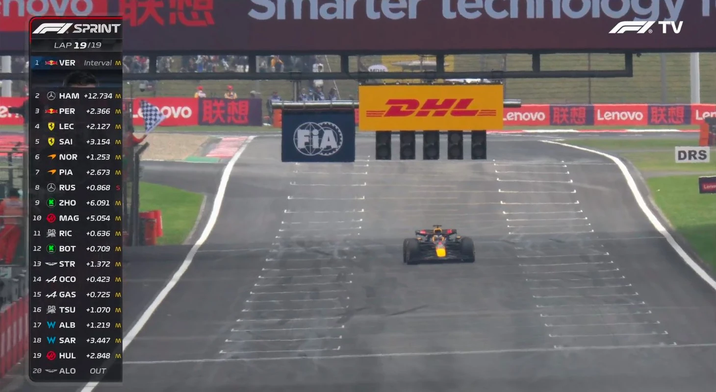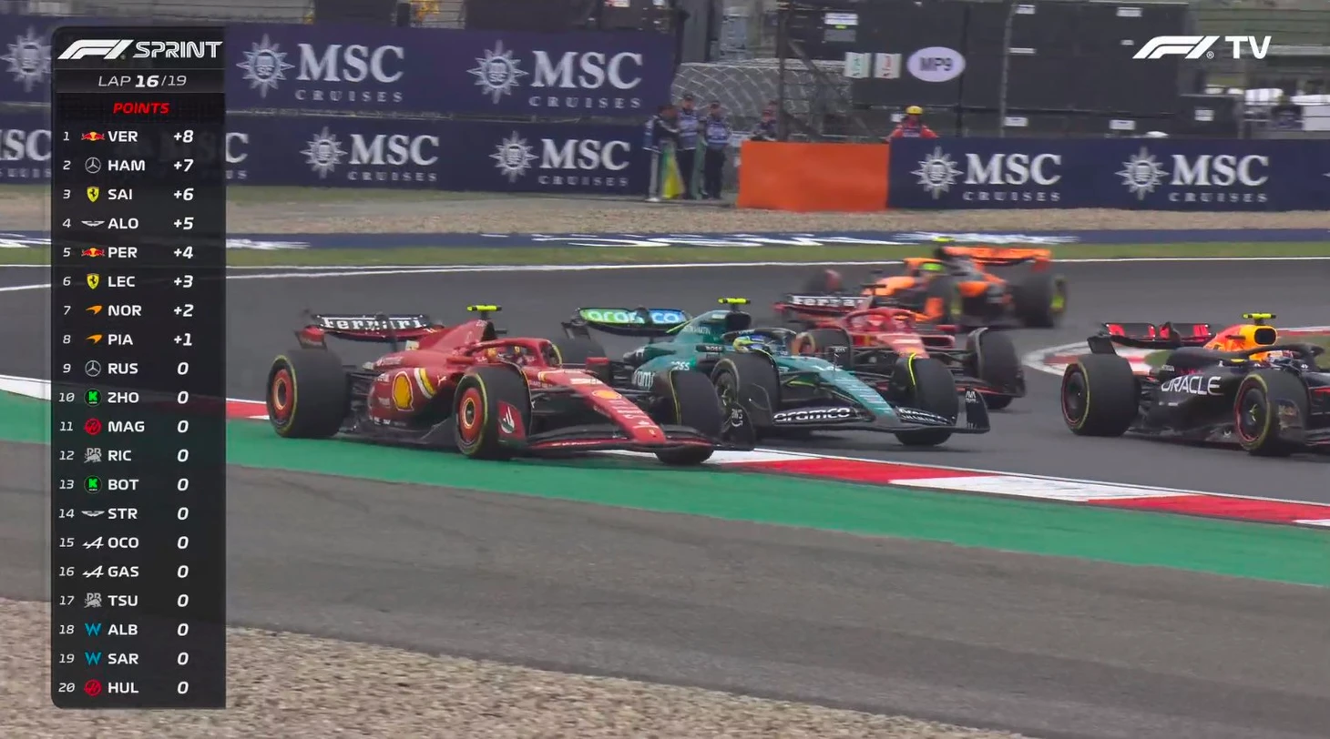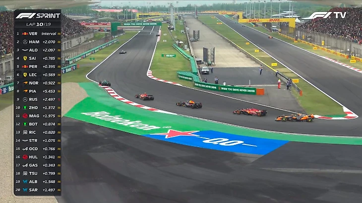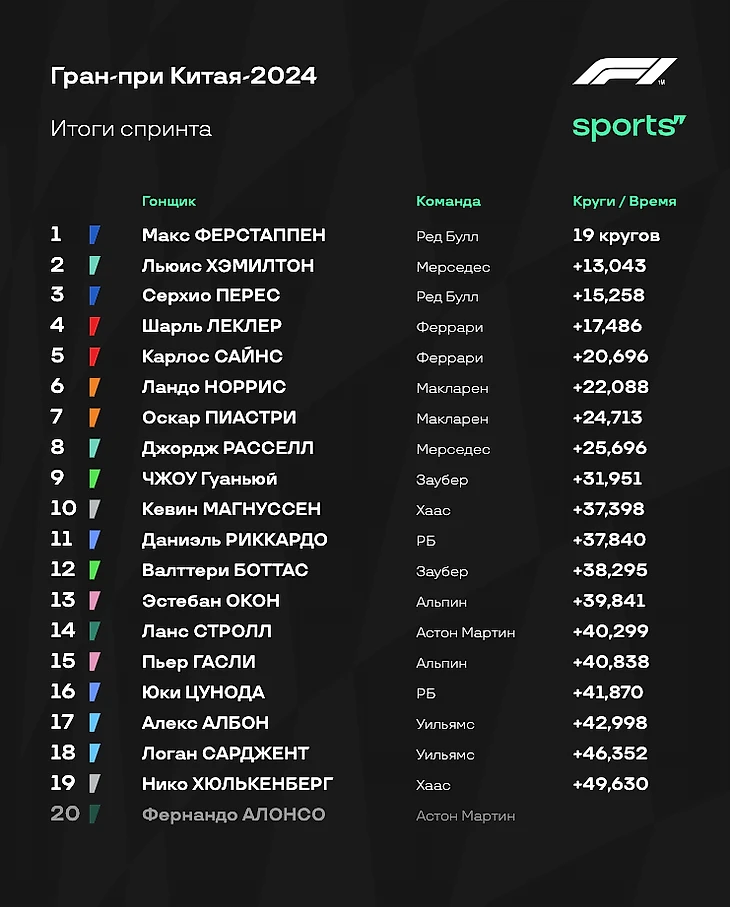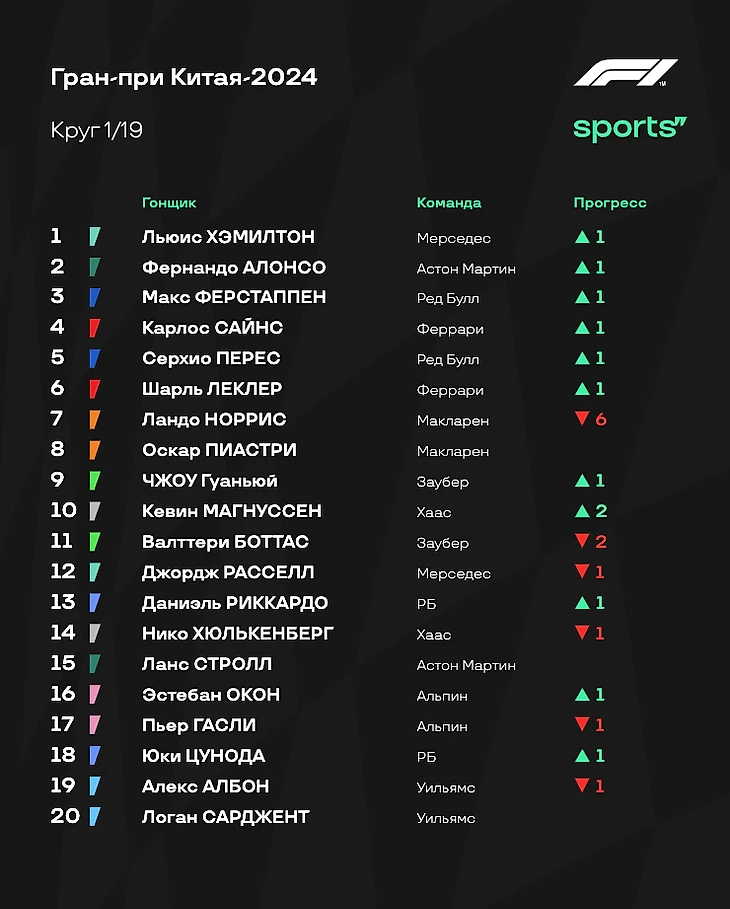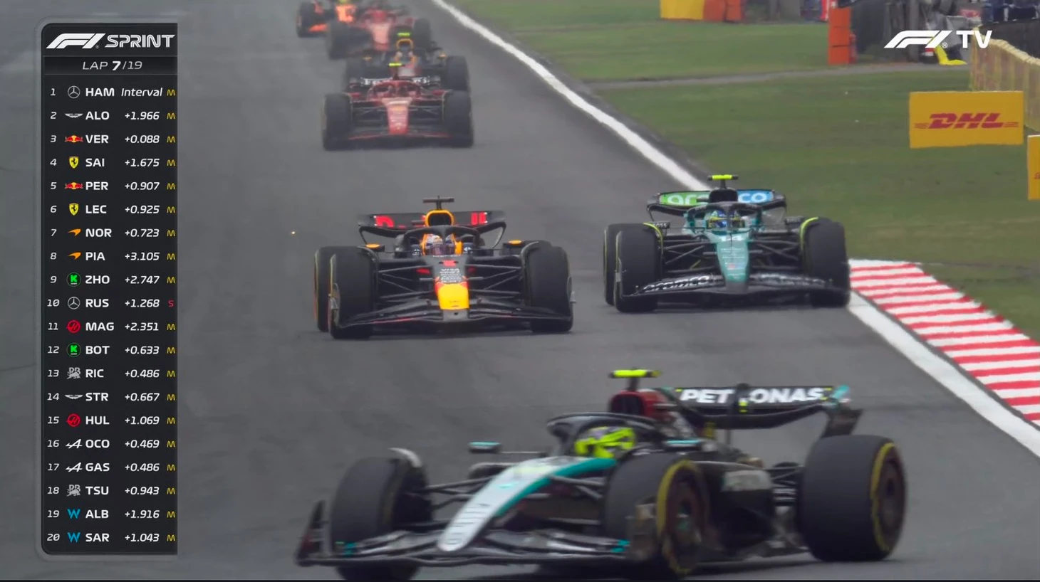 Хэмилтон мощно начал спринт, Норрис не попал во второй поворот и откатился ближе к концу топ-10, Алонсо - второй, Ферстаппен - третий.