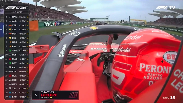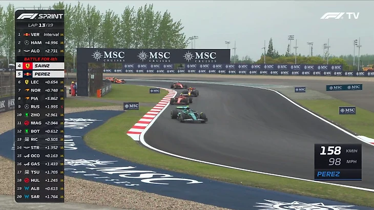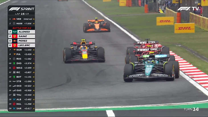 Сайнс преследует Алонсо, но пока не атакует, а Леклер завис за Пересом - и тоже не может совершить маневр (потому что Перес открывает антикрыло благодаря минимальному отставанию от Сайнса).