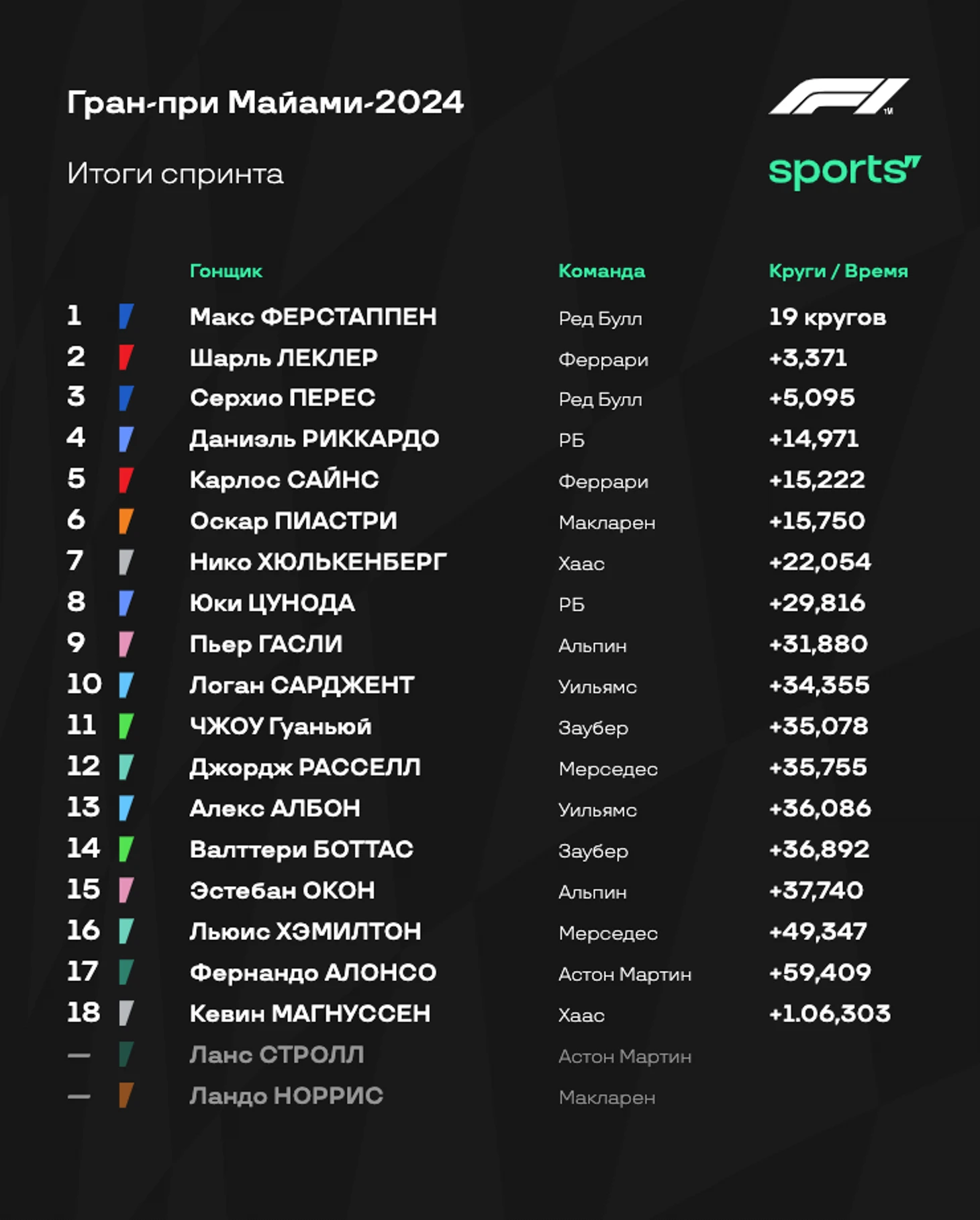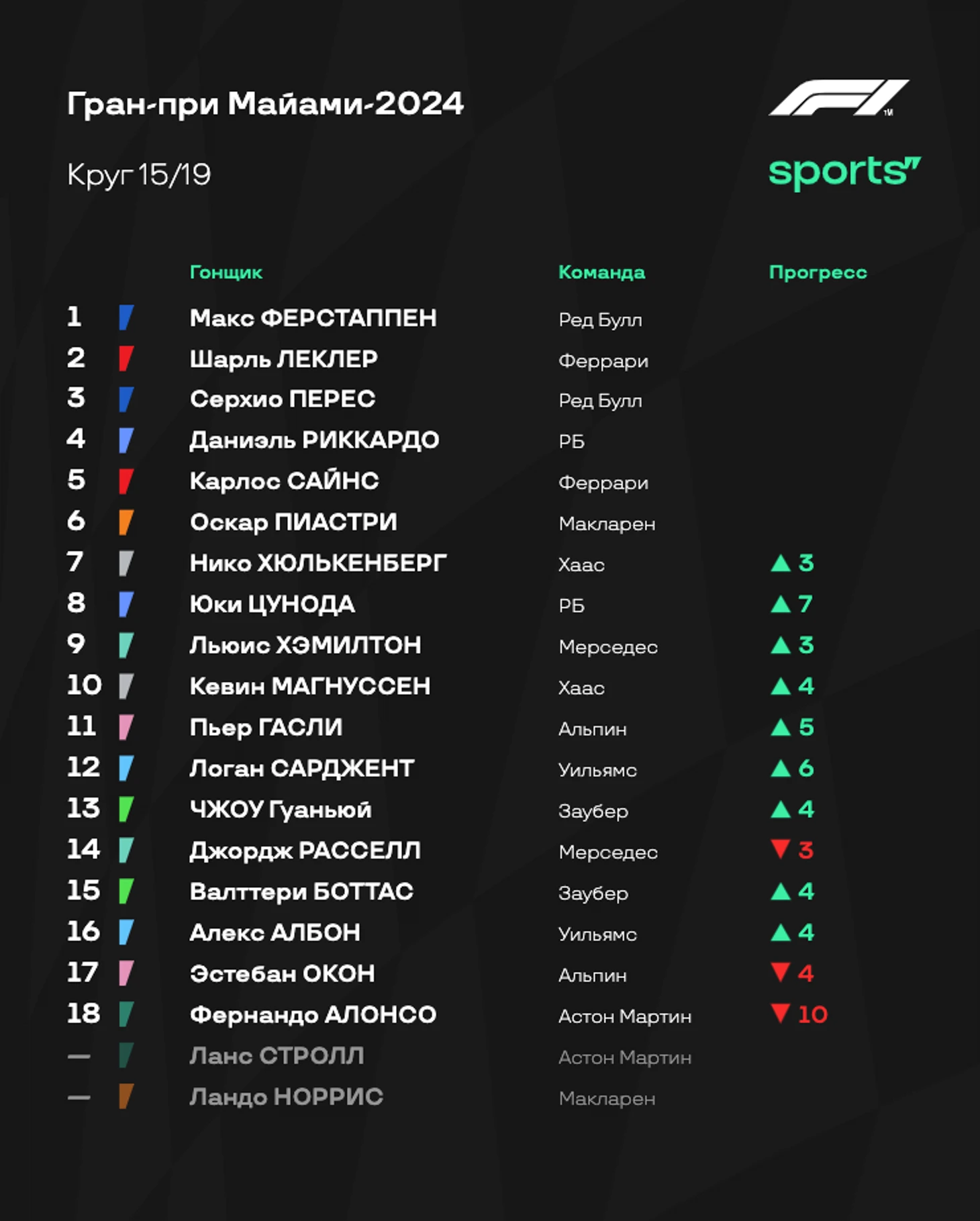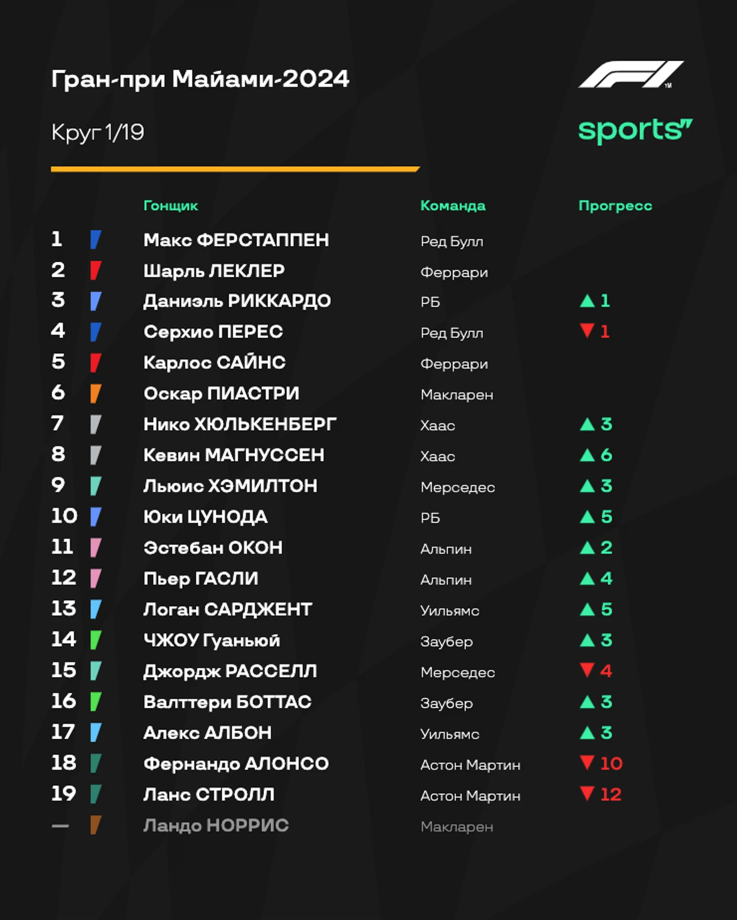 - Все остальные выдали выступления в меру возможностей своих машин. В «Макларене», похоже, улучшили болид, но все же этого пока недостаточно. Особенно для трассы с таким низким сцеплением - у «Феррари» и ее антикивковой подвески в Майами есть преимущество. То же можно сказать и про «Ред Булл». И после того, как лидеры разобрались с настройками и устранили помарки, «Макларен», такое ощущение, потерял последний шанс выдать сенсацию. Впрочем, в гонке все еще возможно.