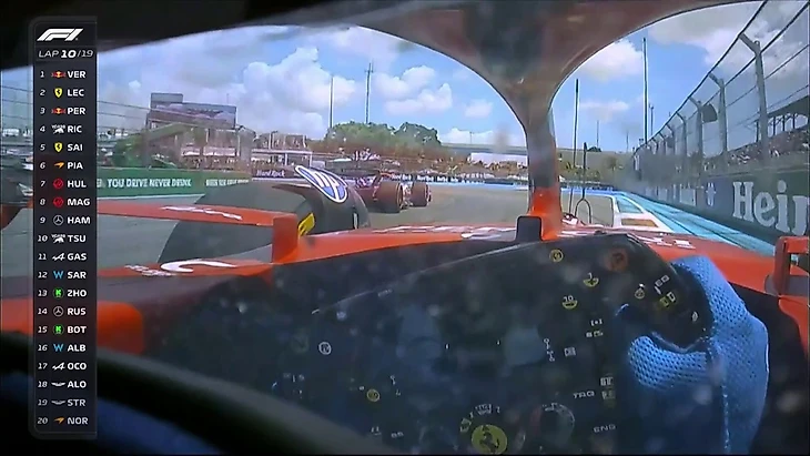 Старт! Ферстаппен удержал лидерство, Леклер остался вторым, а вот Риккардо, Перес и Сайнс мощно зарубились. В итоге Дэн прорвался на третье место!