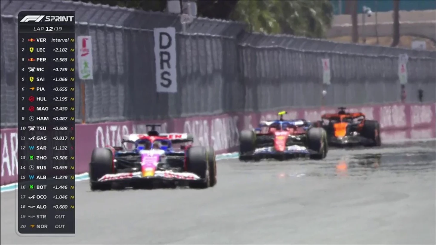 Пока это самая интересная борьба в пелотоне. Риккардо сумел уцепиться за Переса и использует DRS, за счет чего пока отбивается от Сайнса. И сам Перес не может уехать от соперников и даже отстает от Леклера.