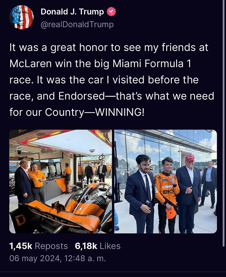«Большая честь была увидеть моих друзей из «Макларена». Это машина, которую я посетил перед гонкой и Одобрил – вот что нам нужно для нашей страны – ПОБЕЖДАТЬ!»