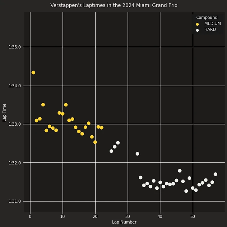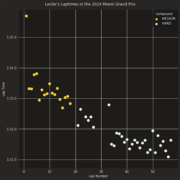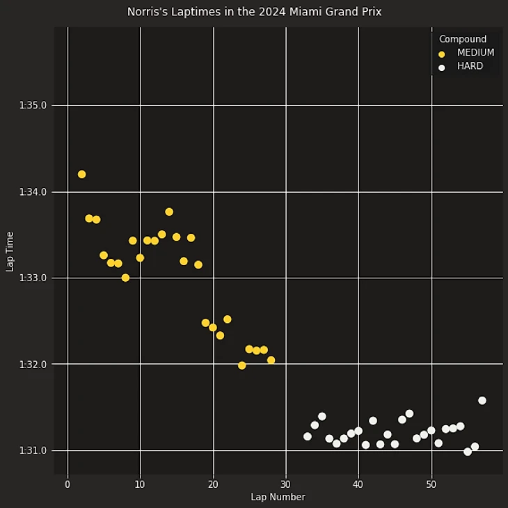 Нанесем на график время прохождения круга призеров Гран-при Майами 2024 Ландо Норриса (победителя), Макса Ферстаппена (занявшего второе место) и Шарля Леклера (занявшего третье место) в гонке с учетом типа шин.