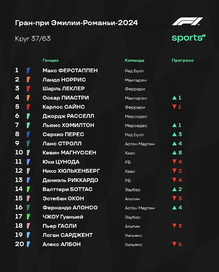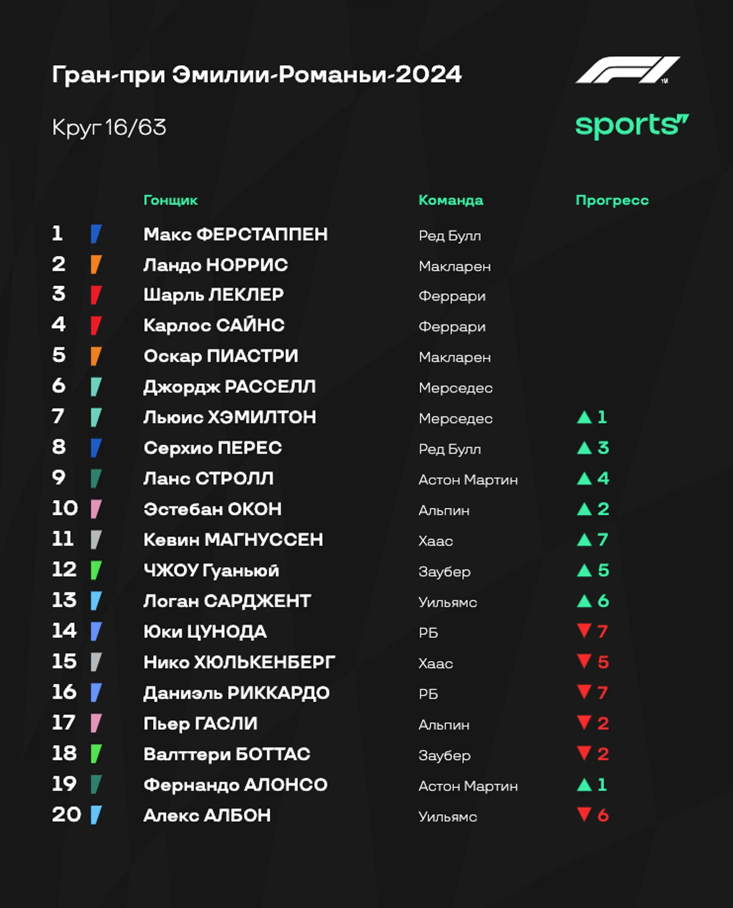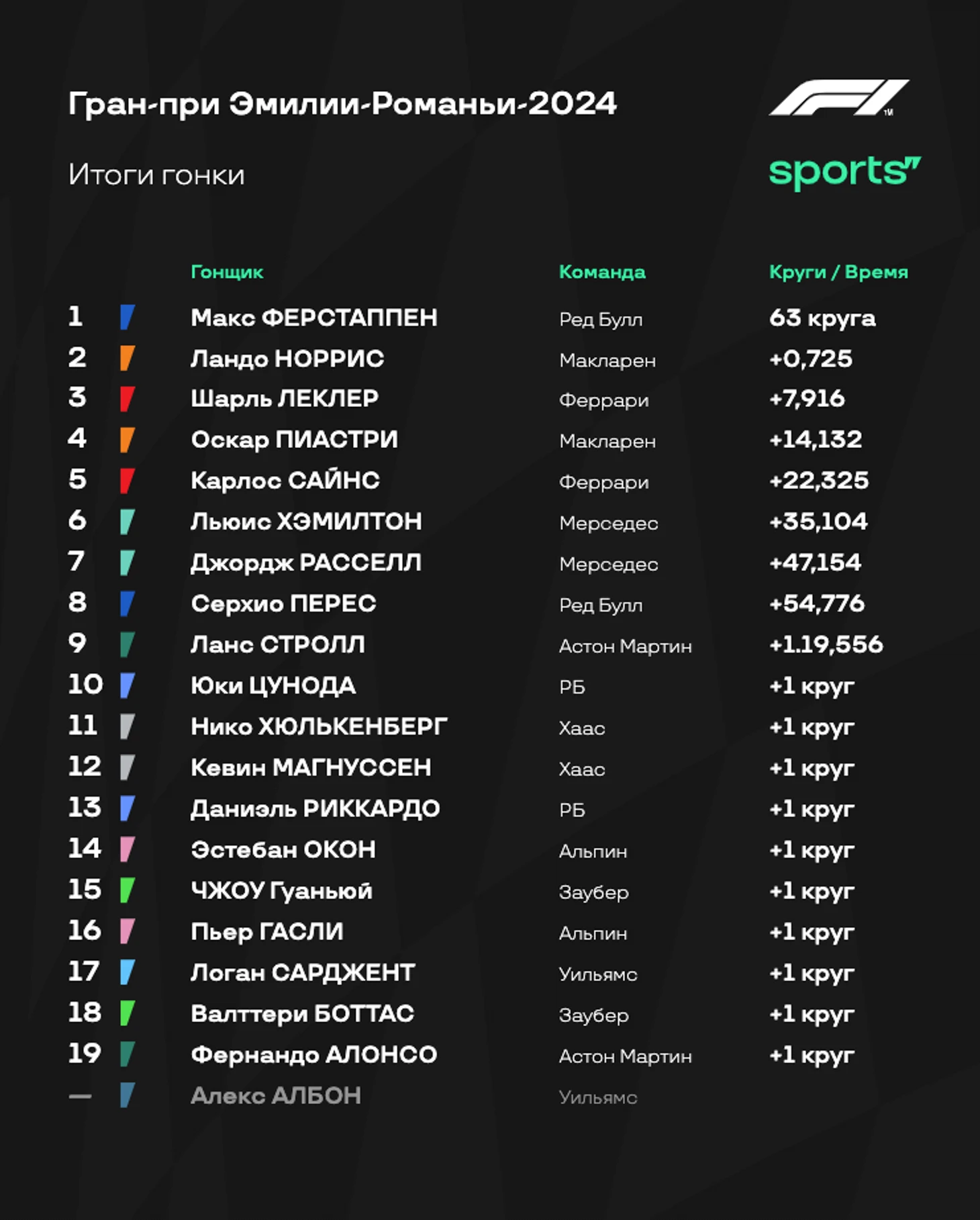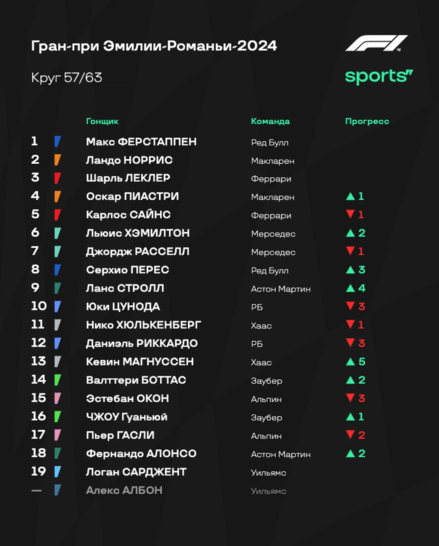 - «Макларен» и правда хорош. Норрис, есть ощущение, сумел сберечь достаточный ресурс шин и в концовке устроил очень мощную погоню за Ферстаппеном. Есть ощущение, что если бы гонка продлилась еще пару кругов, у Ландо был бы реальный шанс пройти Макса. Теперь будем смотреть, что команды покажут в следующих гонках.