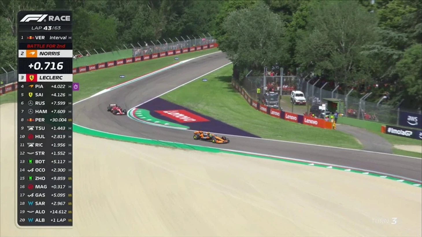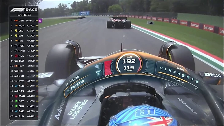 Ох, Ландо чуть-чуть перестарался и допустил пару помарок. До финиша 5 кругов, Ландо пока отстает на 1,7 секунды.