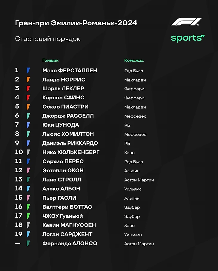 Учитывая все это ключевое значение будет иметь старт. И тут шансы у соперников Макса и правда есть. Поскольку Ферстаппен находится впереди один, а все четыре прямых конкурента стартуют прямо позади него (Серхио Перес квалификацию тоже провалил и не вышел в 3-й сегмент).