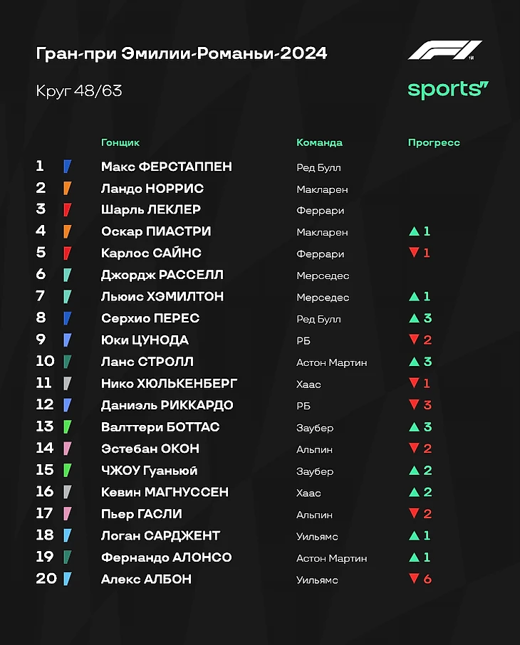 Впереди пока довольно плотно. При этом Норрис отстал от Макса на секунду, но на ту же секунду уехал от Леклера. А вот Сайнс и Пиастри совсем рядом с Шарлем. Чуть дальше два «Мерседеса» начинают постепенно отставать.