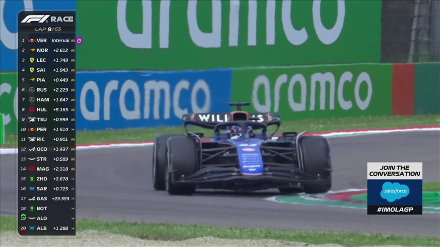 У Албона проблемы. Алекс только-только побывал в боксах, а теперь очень медленно едет по трассе...