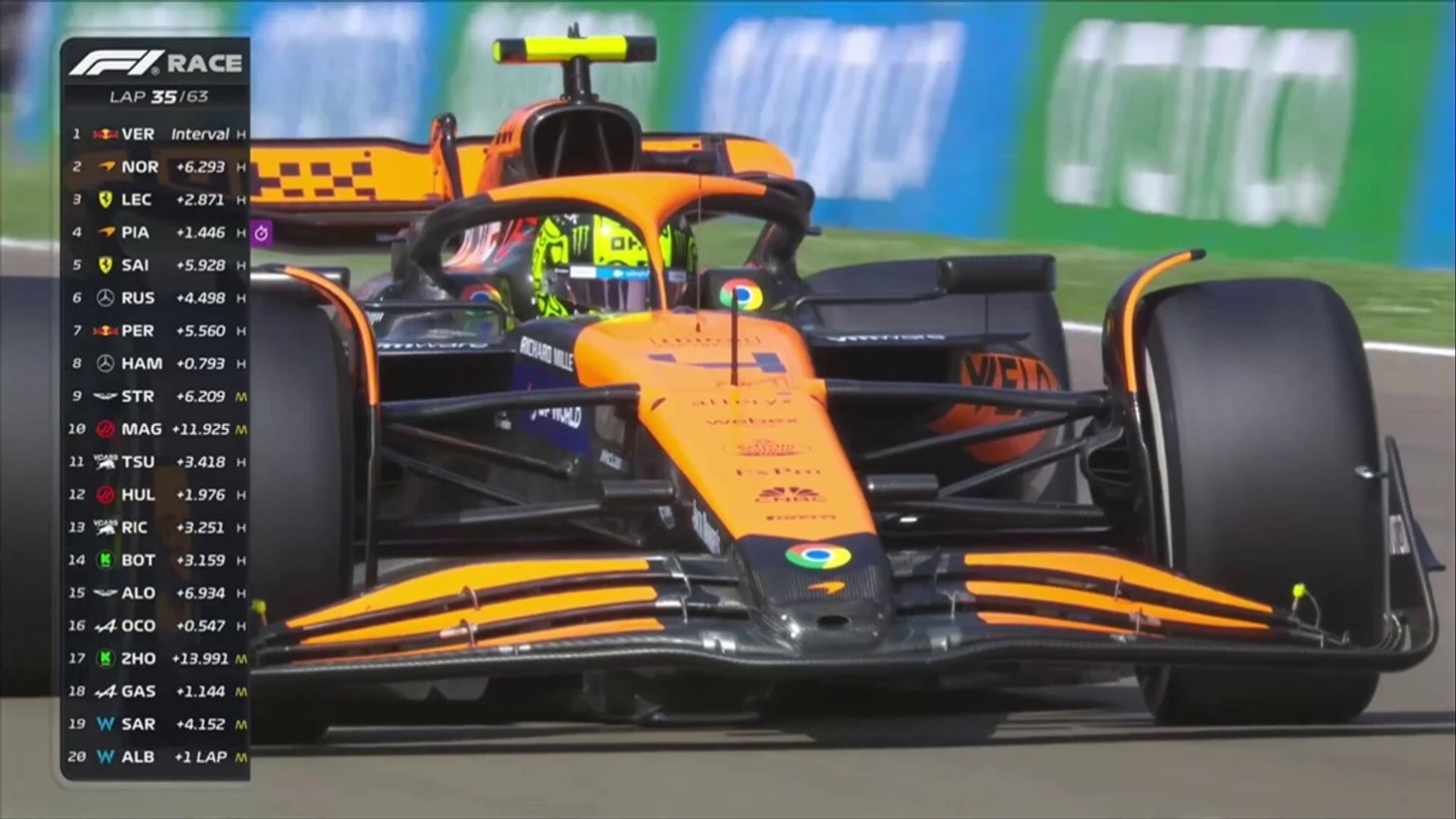 Макс пока делает все, чтобы прикончить интригу в зародыше. К 6-му кругу ему удалось уехать от Норриса почти на 2 секунды. Сам Норрис, без DRS, не подпускает к себе Леклера, который тоже отстал на 1,6 секунды и сейчас больше занят тем, что происходит позади него.