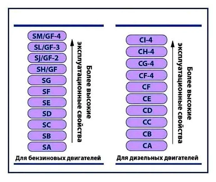 API (от англ. American Petroleum Institute) — стандарт, разработанный Институтом нефти США. Создатели стандарта разделили смазку на два основных вида: