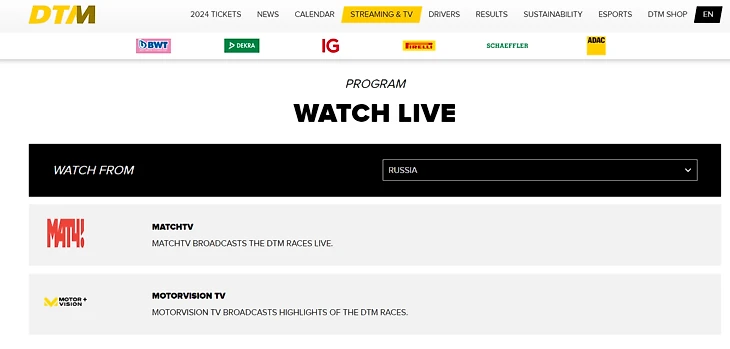 До 2024 года немецкие гонки у нас в стране показывали стриминги viju+sport и «Моторспорт ТВ». Последний вещал по франшизе американского холдинга Motosrport Network – крупнейшей автоспортивной медиагруппы в мире. Но с 1 января тематический «Моторспорт ТВ» прекратил существование в связи с процедурой ликвидации компании правообладателя и теперь ДТМ оперативно нашел новых партнеров в России. Место viju+sport заняла еще одна российская платформа «Старт», которая пока транслирует ДТМ для стран СНГ и Грузии. При этом на «Старте» в прямом эфире дополнительно показывают квалификации перед каждым из двух заездов (но без обильной программы гонок поддержки, как делал раньше «Моторспорт ТВ»), тогда как «Матч» предлагает своим зрителям минимум – только две гонки в субботу и воскресенье.