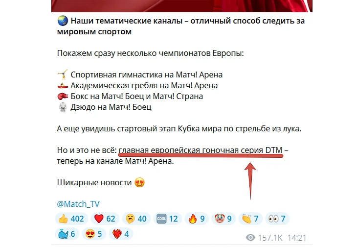 Информацию о том, что федеральное ТВ официально покажет гонки зарубежной серии, первыми распространили телеграм-каналы, отслеживающие российский телерынок. Сам «Матч» презентовал премьеру более чем скромно: при поиске на сайте по ключевым словам «ДТМ» и «DTM» выходят старые тексты, а в соцсетях можно найти только короткое упоминание серии в посте от 18 апреля.