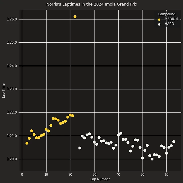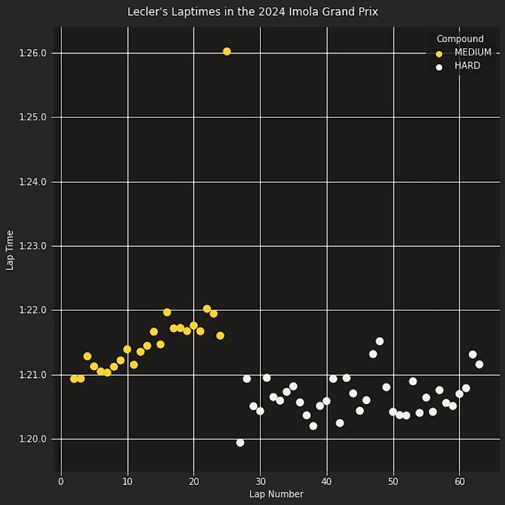 По оси х отложены круги гонки, по у - время гонщика. Цвет кружочка отражает типы шины: желтый - медиум, белый - хард.