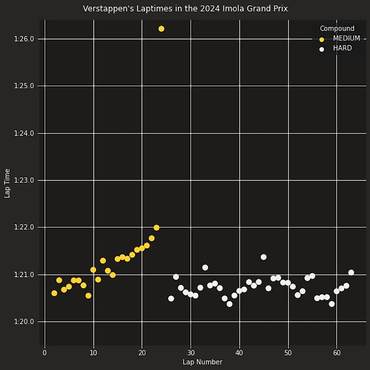 Нанесем на график время прохождения круга призеров Гран-при Эмилии-Романьи 2024 Макса Ферстаппена (победителя), Ландо Норриса(занявшего второе место) и Шарля Леклера (занявшего третье место) в гонке с учетом типа шин.