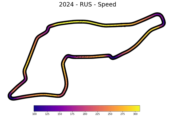 Визуализируем распределение скорости Джорджа Рассела, установившего быстрейший круг на Гран-при Эмилии-Романьи, на этом самом круге.