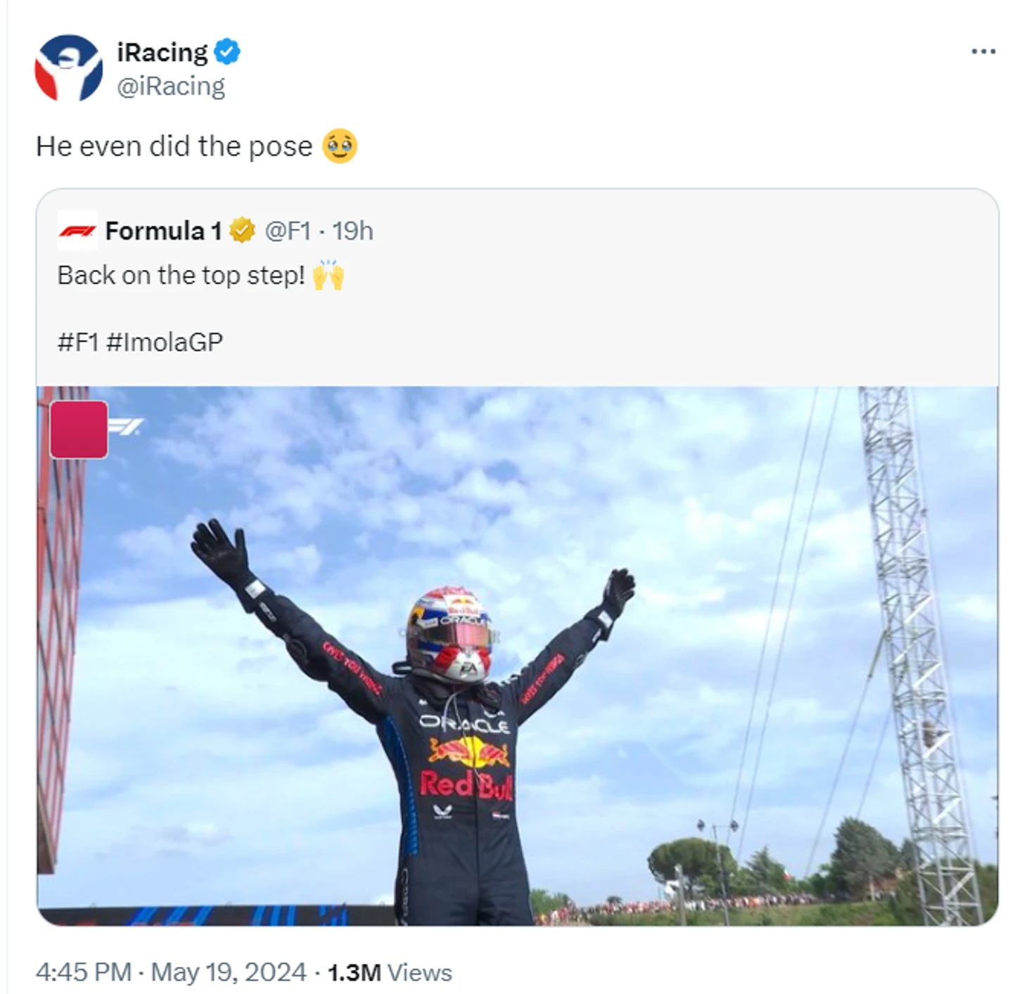Но да, Макс победил – и отпраздновал позой с фирменного логотипа iRacing!
