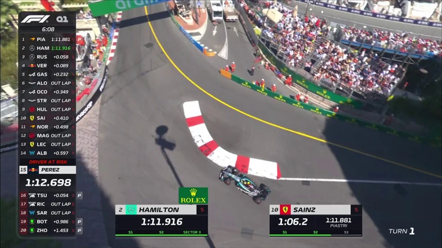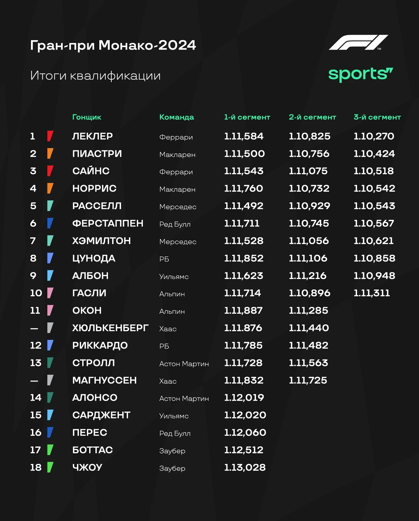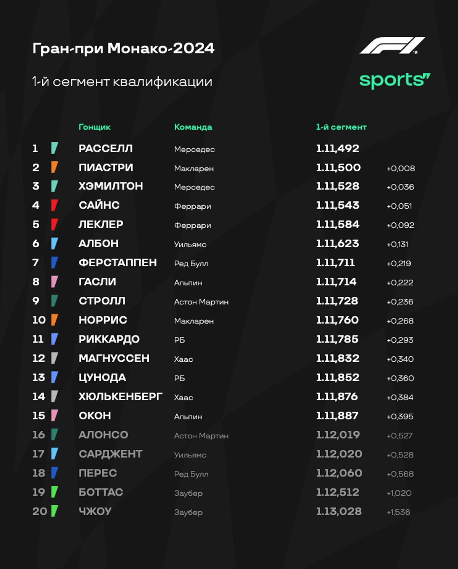 Сайнс пытался, но взял лишь третье время. Норрис четвертый. Макс Ферстаппен в последней попытке задел стену и не сумел улучшить, у Макса шестое время, между двумя «Мерседесами».