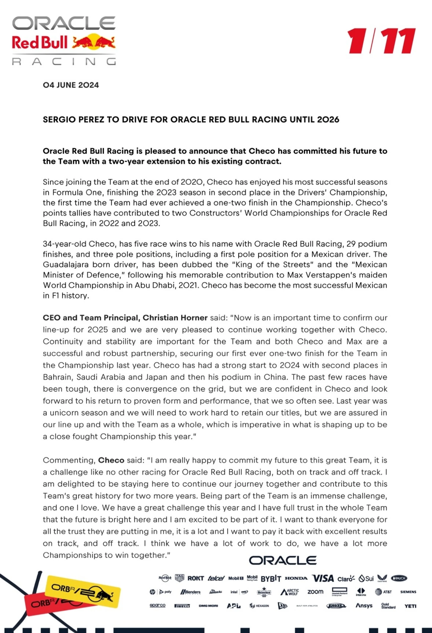 «Наступил важный момент, чтобы подтвердить наш состав на сезон-2025, и мы очень рады продолжить работу с Чеко. Преемственность и стабильность важна для команды, и Чеко с Максом [Ферстаппеном] сформировали успешное и прочное партнерство, которое позволило нам впервые закончить чемпионат на первом и втором местах в прошлом году».