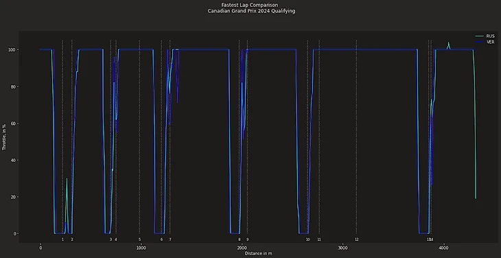 По оси у- степень открытия дроссельная заслонки каждого гонщика (в процентах), по оси х - отложена дистанция трассы. Вертикальными линиями показаны номера соответствующих поворотов. Бирюзовым цветом показан график - Джорджа Рассела, а синим соответственно Макса Ферстаппена.