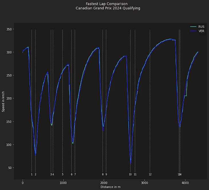 По оси у- отложена скорость каждого гонщика, по оси х - отложена дистанция трассы. Вертикальными линиями показаны номера соответствующих поворотов. Бирюзовым цветом показан график скорости - Джорджа Рассела, а синим соответственно Макса Ферстаппена.