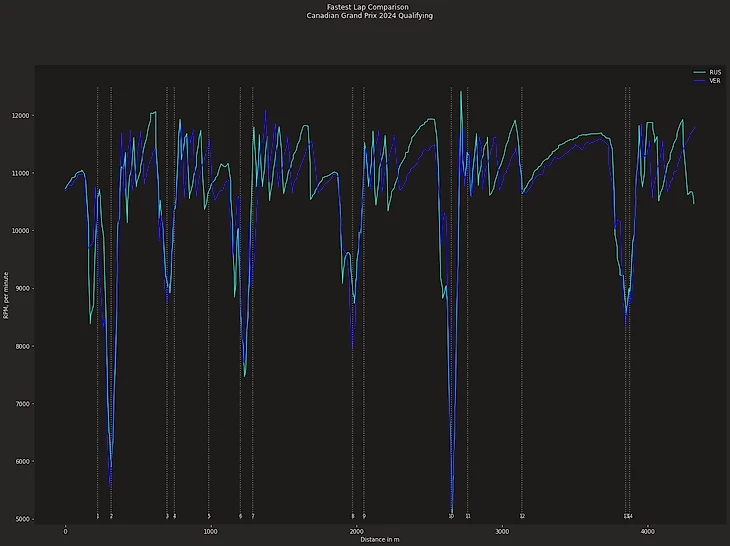 По оси у- отложены обороты которые развивал двигатель каждого гонщика, по оси х - отложена дистанция трассы. Вертикальными линиями показаны номера соответствующих поворотов. Бирюзовым цветом показан график - Джорджа Рассела, а синим соответственно Макса Ферстаппена.