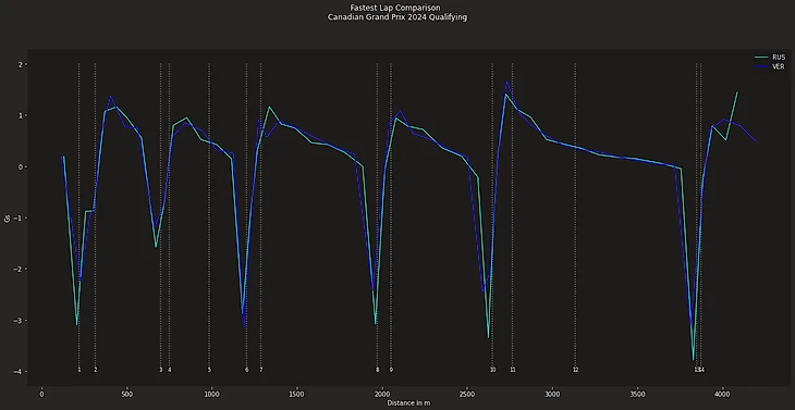 По оси у показана перегрузка, которую испытывал (в g), каждый гонщик, по оси х - отложена дистанция трассы. Вертикальными линиями показаны номера соответствующих поворотов. Бирюзовым цветом показан график - Джорджа Рассела, а синим соответственно Макса Ферстаппена.