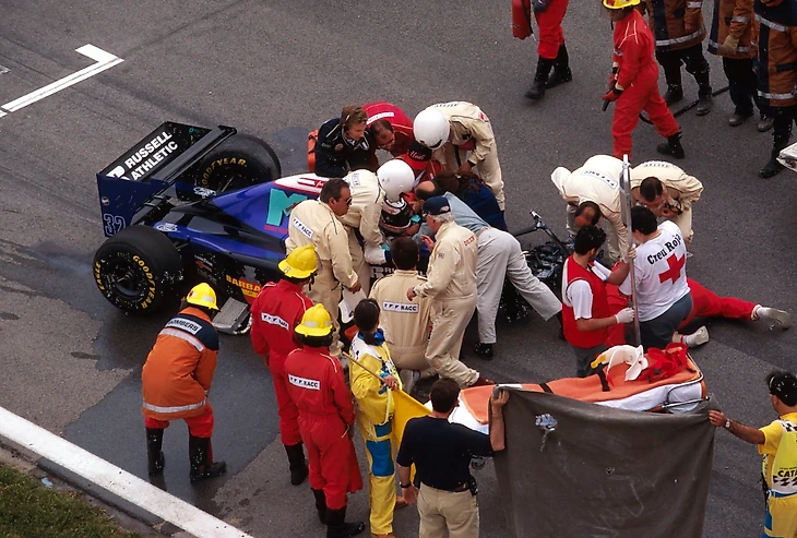 Казалось, что жестокие боги напоминали спорту, на что они способны, если захотят, и в некоторых местах пресс-центра, откуда открывается вид на место происшествия, было что-то неприятно близкое к истерике, когда люди смотрели вниз на искорёженный «Симтек». Ситуация казалась похожей на инцидент с Ратценбергером в Имоле, тем более что Монтермини заменил его в команде.