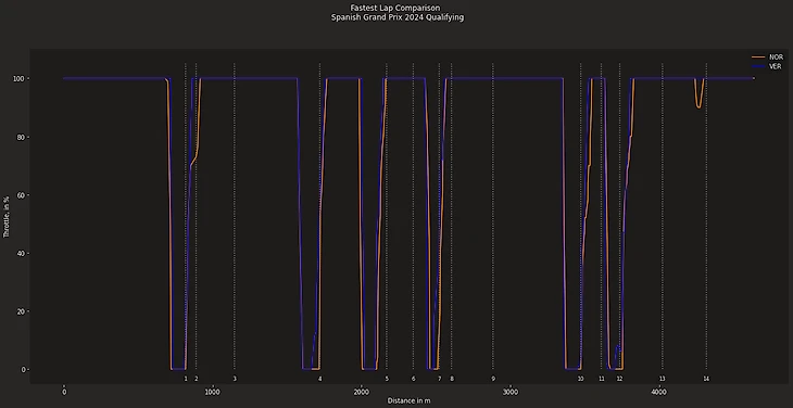 По оси у- степень открытия дроссельная заслонки каждого гонщика (в процентах), по оси х - отложена дистанция трассы. Вертикальными линиями показаны номера соответствующих поворотов. Оранжевым цветом показан график - Ландо Норриса, а синим соответственно Макса Ферстаппена.