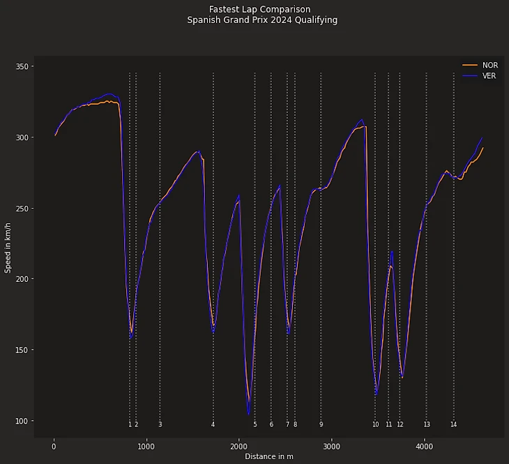 По оси у- отложена скорость каждого гонщика, по оси х - отложена дистанция трассы. Вертикальными линиями показаны номера соответствующих поворотов. Оранжевым цветом показан график скорости - Ландо Норриса, а синим соответственно Макса Ферстаппена.