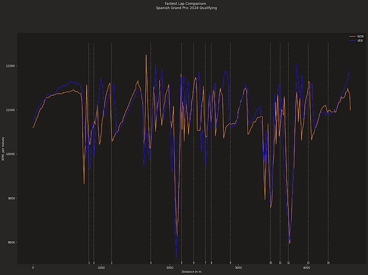 По оси у- отложены обороты которые развивал двигатель каждого гонщика, по оси х - отложена дистанция трассы. Вертикальными линиями показаны номера соответствующих поворотов. Оранжевым цветом показан график - Ландо Норриса, а синим соответственно Макса Ферстаппена.