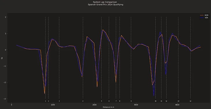 По оси у показана перегрузка, которую испытывал (в g), каждый гонщик, по оси х - отложена дистанция трассы. Вертикальными линиями показаны номера соответствующих поворотов. Оранжевым цветом показан график - Ландо Норриса, а синим соответственно Макса Ферстаппена.