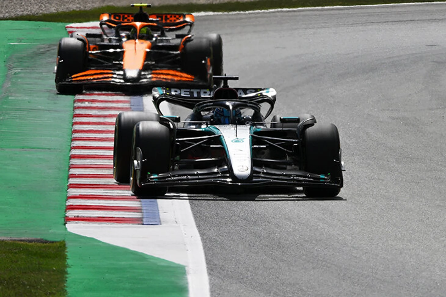 Джордж Расселл – безусловно, потрясающий талант с прекрасным чутьем: на старте моментально просчитал борьбу Норриса и Ферстаппена, оценил возможности собственной машины, нырнул на внешнюю накатанную траекторию и уже на входе в первый поворот стал лидером пелотона.
