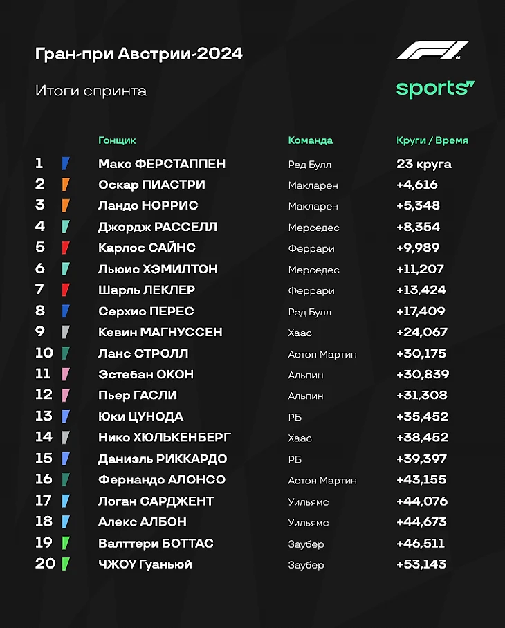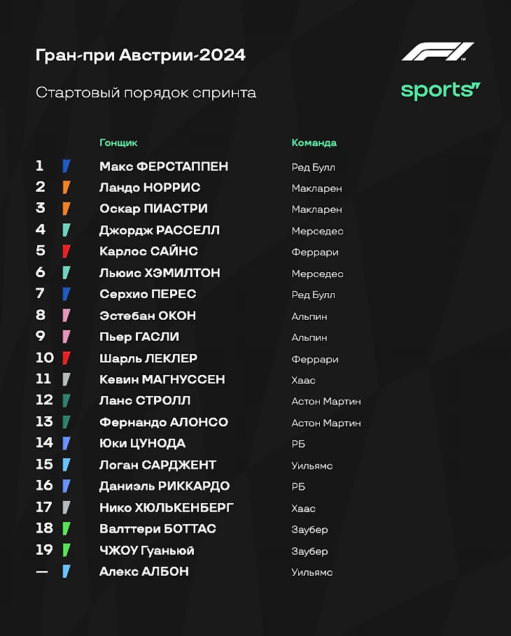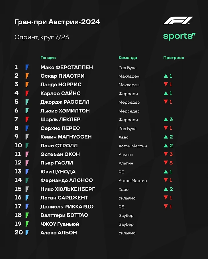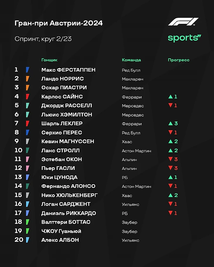 - Начало вышло напряженным. Ферстаппену пришлось побороться с «Макларенами», но дальше соперники сами устранились. Пиастри, вероятно, быстро «убил» резину, а потом начал защищать позицию от Ландо - это и позволило Максу спокойно забрать восемь очков за победу. - «Феррари» выглядит неуверенно, в отличие от «Мерседеса». Похоже, у «серебряных» и вправду довольно неплохой гоночный темп. А вот Скудерии нужно что-то менять - может быть, после спринта итальянцы внесут изменения в настройки. - У Переса нет темпа. Чеко протоптался весь спринт на восьмой позиции - даже уступив место Леклеру (который стартовал 10-м!). Все больше вопросов к его продлению в «Ред Булл». - «Альпин» подтянулась. Команда выглядела вполне неплохо по ходу спринта и даже смогла надавить на «Астон Мартин». В начале сезона это казалось фантастикой. - У Алонсо не складывается. Фернандо продолжает страдать за рулем AMR24. Может быть, команде удастся что-то изменить после спринта?