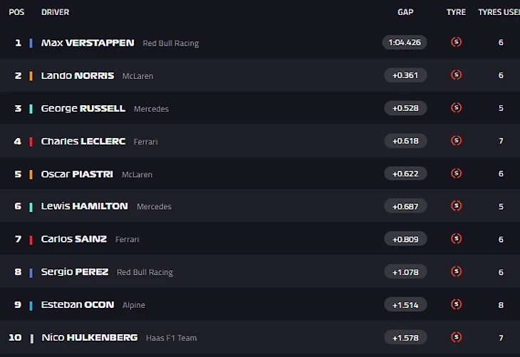 Норрис в 0,3 секунды, а дальше все отстают от Ферстаппена больше чем на полсекунды. Третий - Расселл, он в 0,528 секунды.