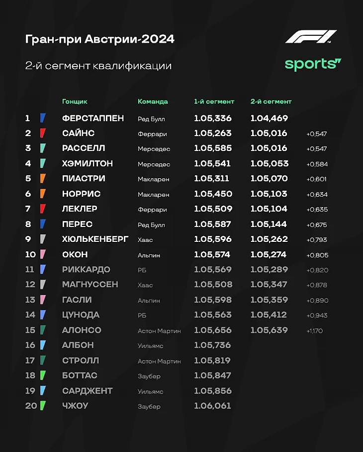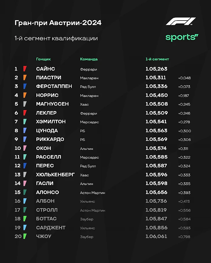 - Ферстаппен максимально уверенно взял поул. Он смог опередить второе место на 0,4 секунды - что просто гигантское преимущество на таком коротком и скоростном треке, как «Ред Булл Ринг». И это еще при том, что остальные лидеры идут очень плотно с отставанием друг от друга в пределах одной десятой. Во многом этому поспособствовали условия: командам нужно было найти оптимальные настройки, которые помогут пилотам рисковать на трассе. Дальше все оставалось за исполнителями. Очевидно, «Ред Булл» и Макс идеально дополнили друг друга. Остальные попросту не смогли добиться такого же баланса. P.S. И не стоит забывать, что в Испании Ферстаппену поставили новый мотор, который вполне могли поднастроить к Австрии. - «Мерседес» вернулся в большую игру! Похоже, обновления работают блестяще и подходят для разных трасс. Уже месяц команда из Бракли чувствует себя вполне хорошо в первой пятерке. Возможно, в Австрии ей удастся добыть третий подиум в сезоне. - «Феррари» вся в проблемах. Скудерия испытывает трудности с перегревом тормозов - да и в принципе неполадок больше, чем ожидали в команде. Шарль Леклер даже перешел после спринта на рискованные настройки, и они себя не оправдали. Но настрой таков, что терять почти нечего. - «Астон Мартин» в тупике. Алонсо продолжает страдать от ужасного баланса, а в Шпильберге это катастрофа. Он не может идти в рискованные атаки, а значит, вынужден терять время. Много времени. - «РБ» пока не могут разобраться со своими обновлениями, так что в Австрии все решил опыт.