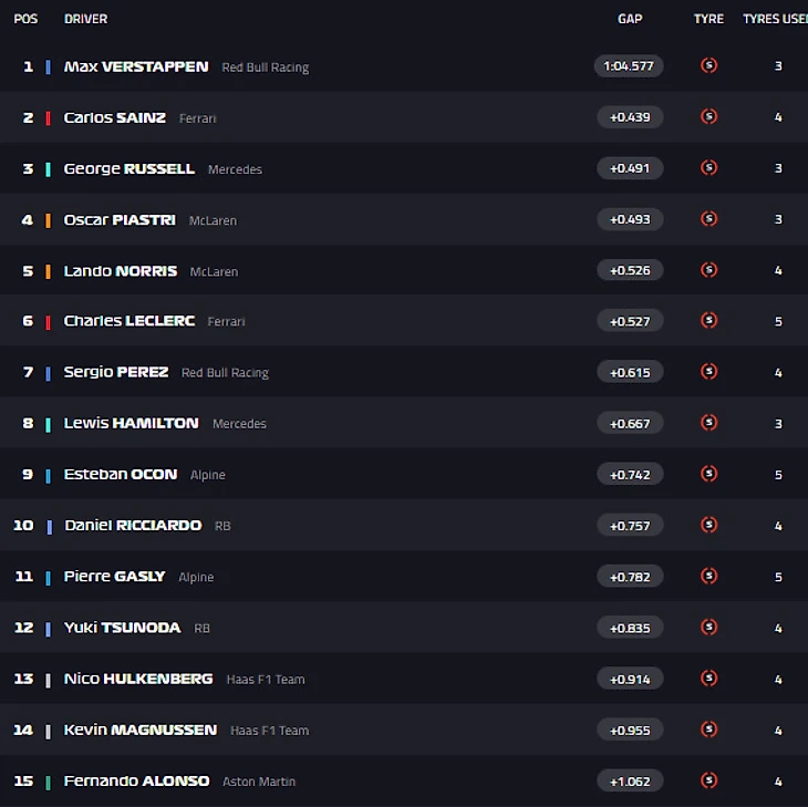 Макс далеко впереди остальных, «Макларены» позади «Феррари» и «Мерседеса», Хюлькенберг и Окон в третьем сегменте. Вылетели Риккардо, Магнуссен, Гасли, Цунода, Алонсо.