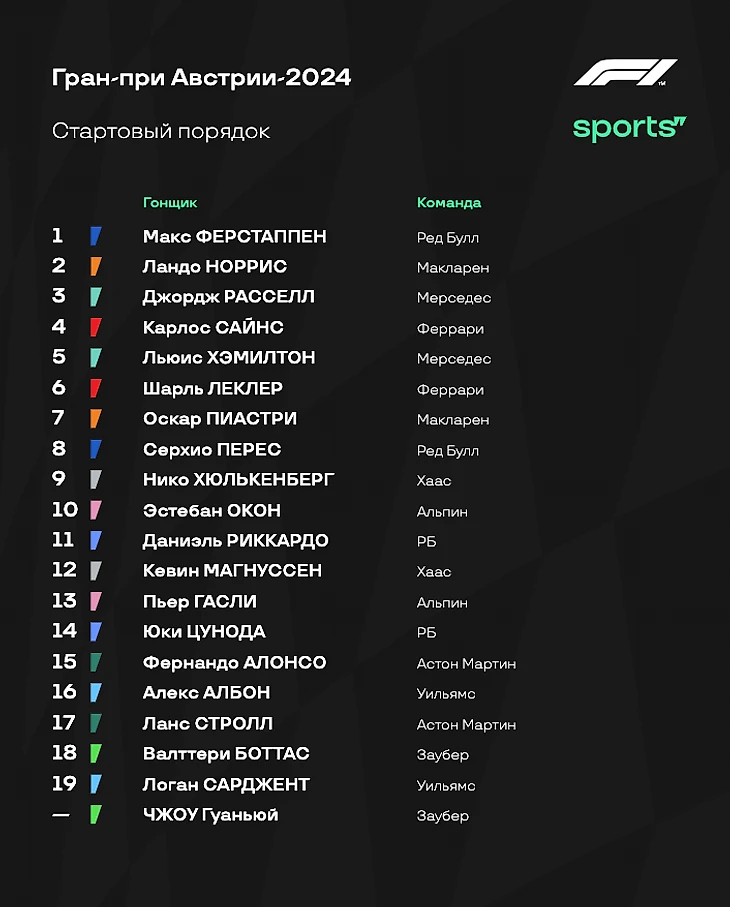 Информация по шинам. Как и предсказывал Расселл, никаких сюрпризов. Практически все стартуют на «медиуме». Единственное исключение - Чжоу, который выбрал «хард» и начинает гонку с пит-лейн.