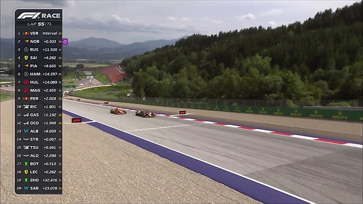 Ой-ей! Норрис провел еще одну атаку, вышел вперед, и Макс сохранил позицию только за счет того, что выехал за пределы трассы и разогнался оттуда!